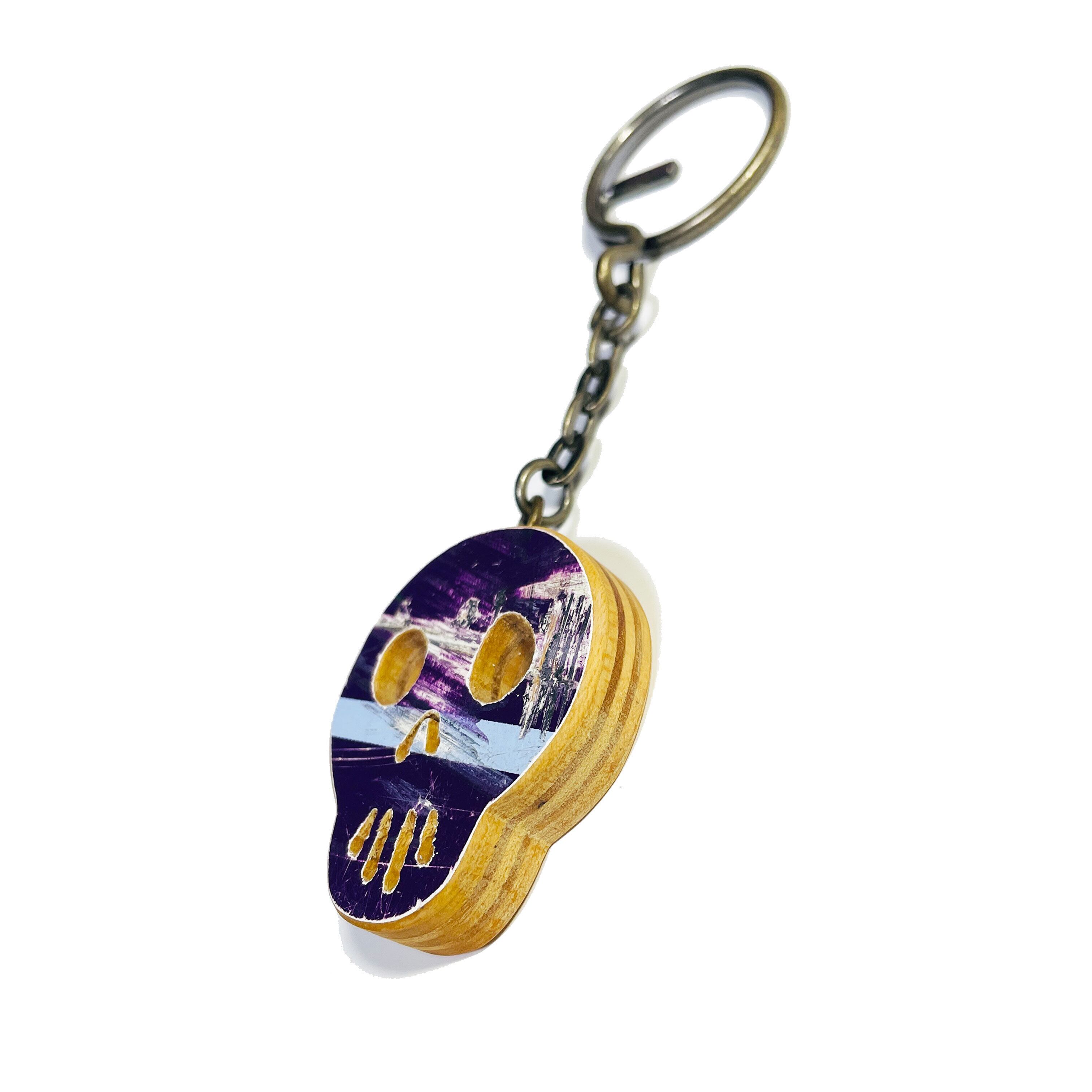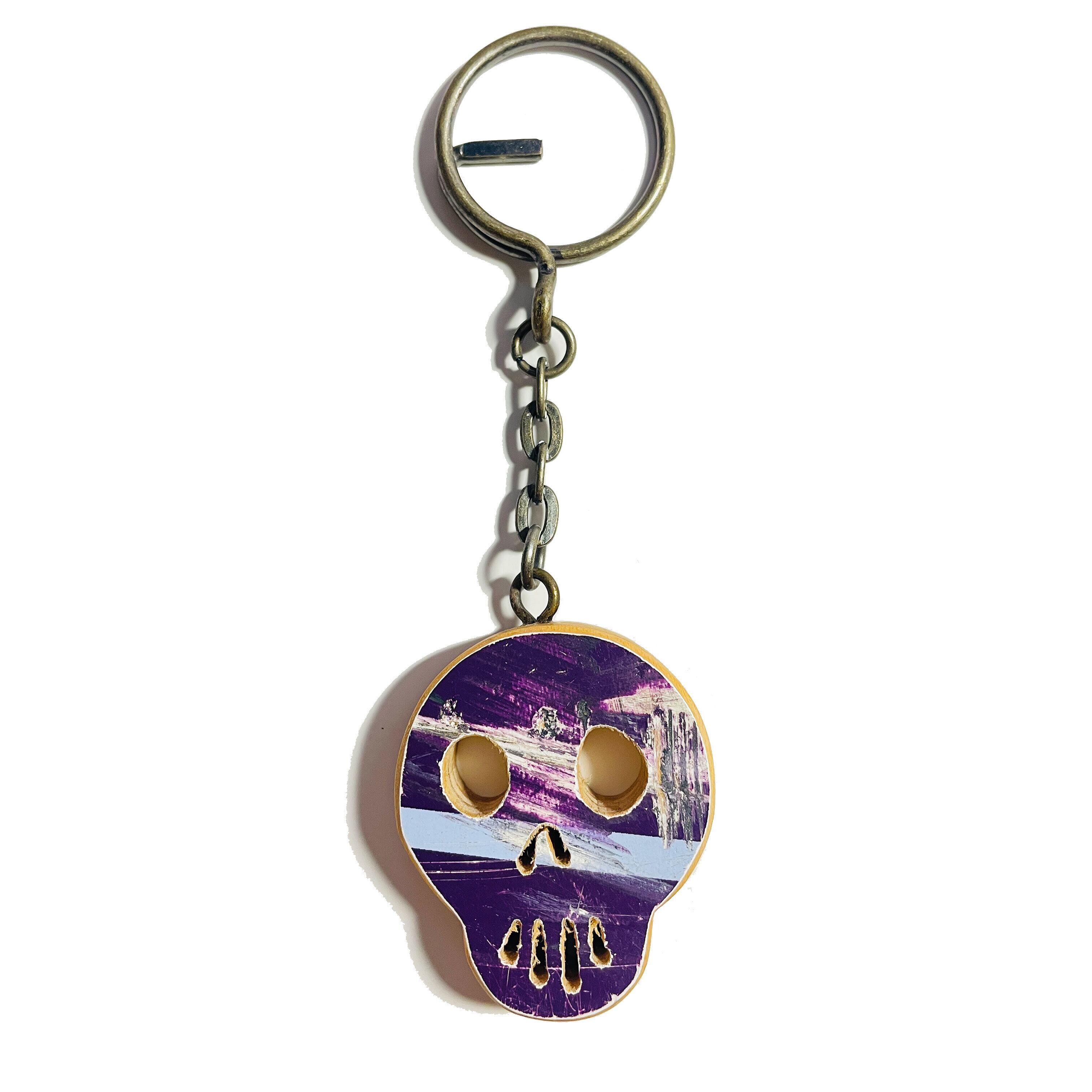 スケボーデッキで一点一点ハンドメイドで作られた、スカルデザインのキーホルダーです。