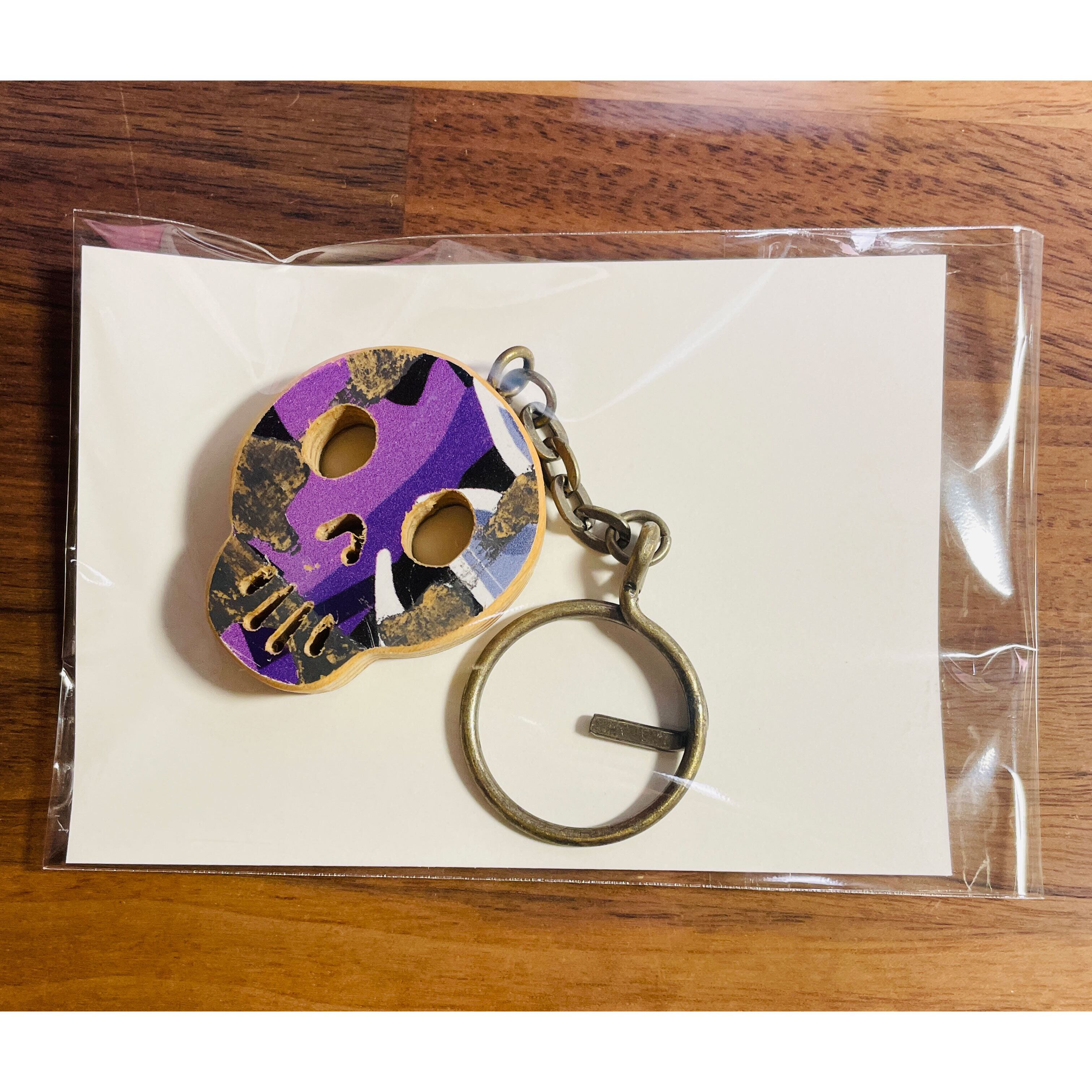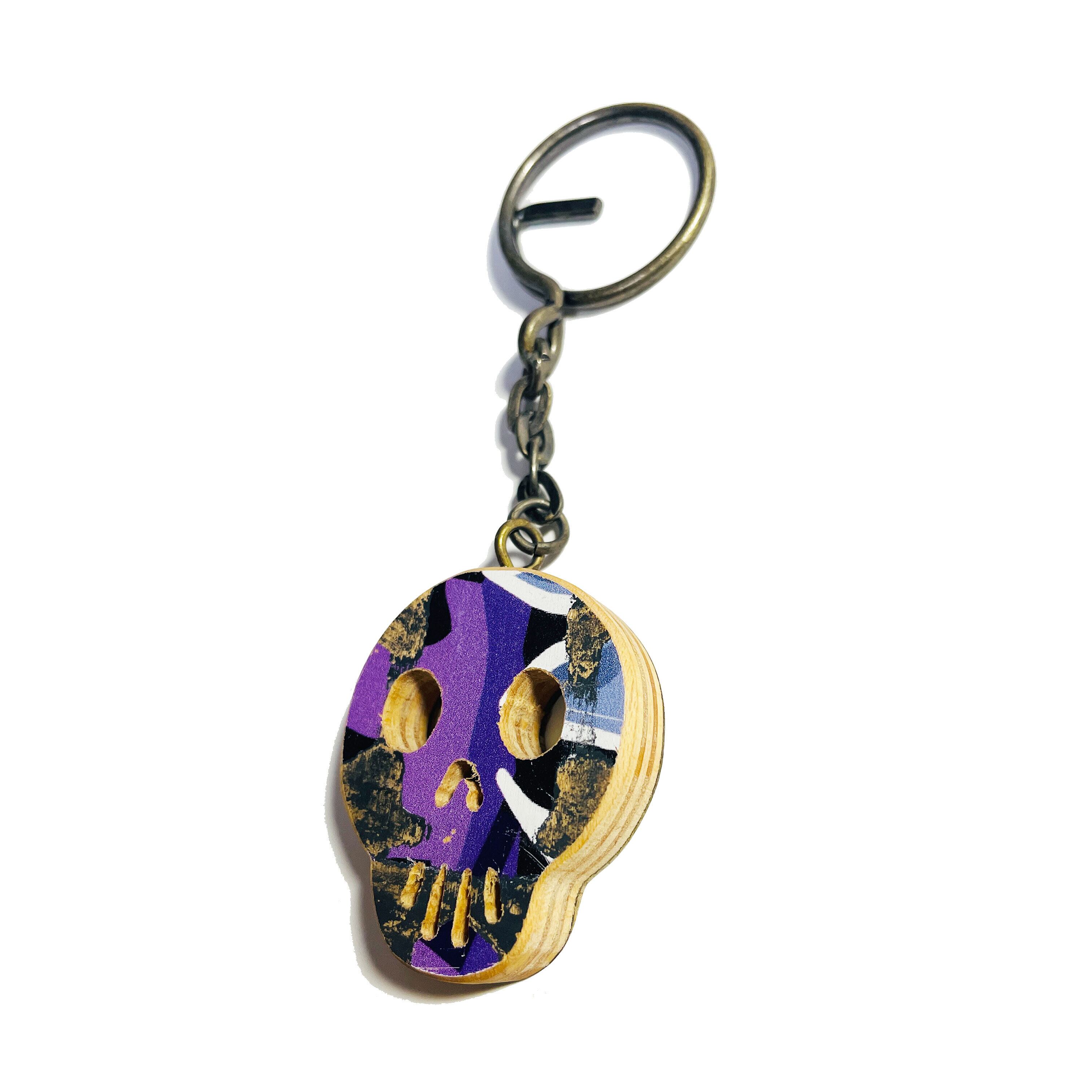 スケボーデッキで一点一点ハンドメイドで作られた、スカルデザインのキーホルダーです。