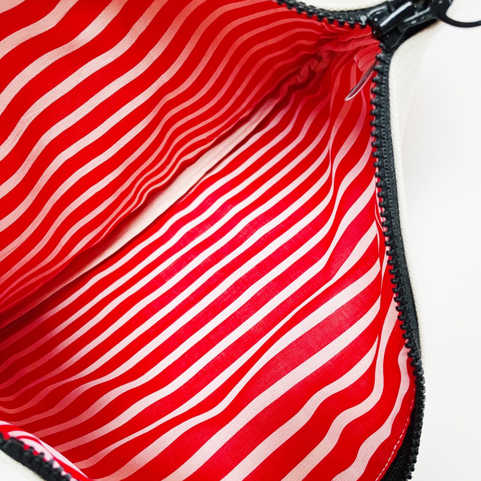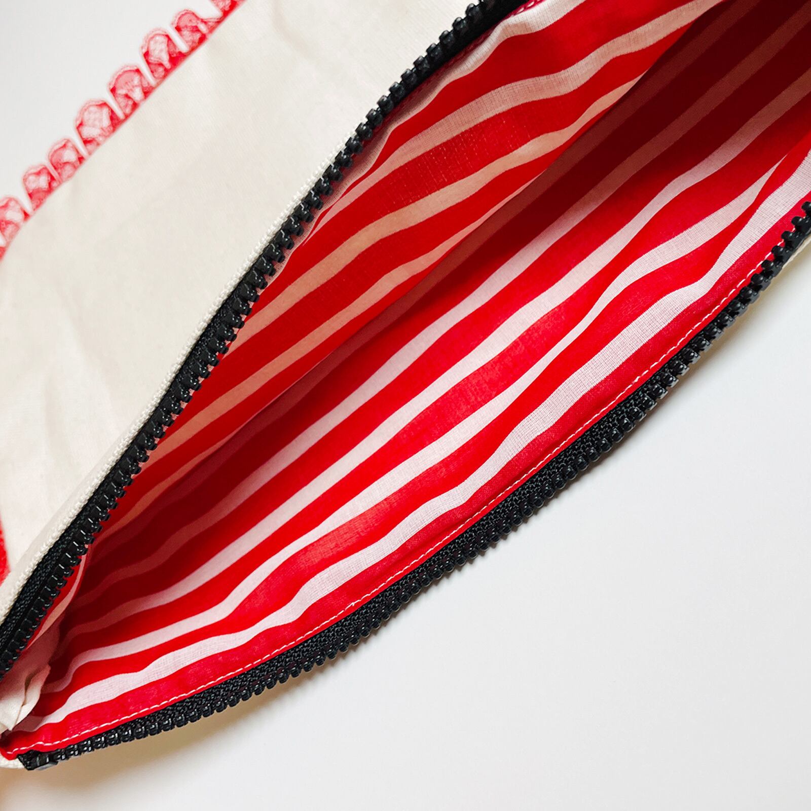 表のはトートバッグのようなしっかりした生成り色の生地で、裏地は赤いボーダー柄。